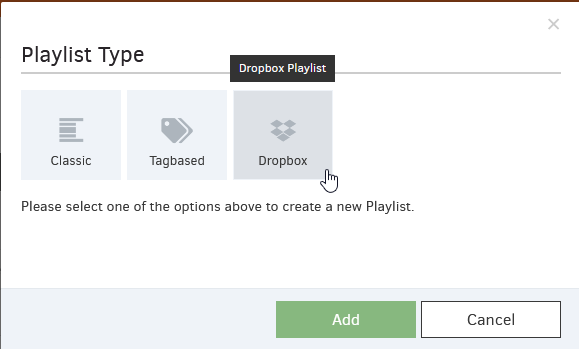 To add a Dropbox playlist, you click on the ” + Add Playlist ” button found at the bottom of the Playlists list.