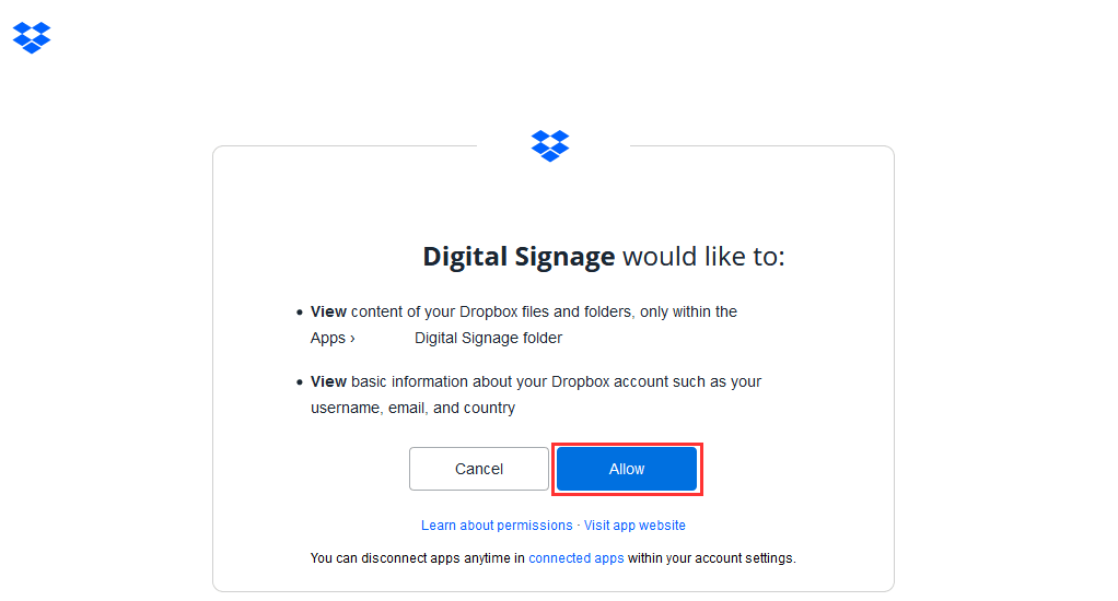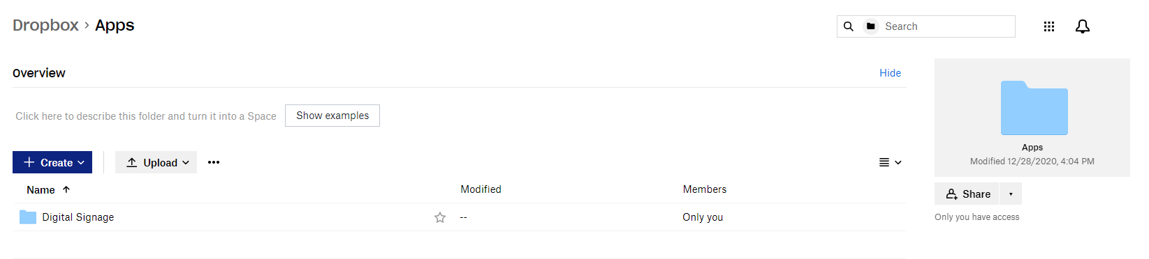 A new folder will be created under your Dropbox account and, more specifically, in the Apps section. This folder is called Digital Signage , and it is the default folder where your players will “pull” the images from it.