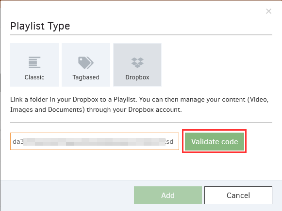Copy this code and paste it into your Dropbox playlist. By clicking the Validate code button, your Dropbox playlist is ready for use.