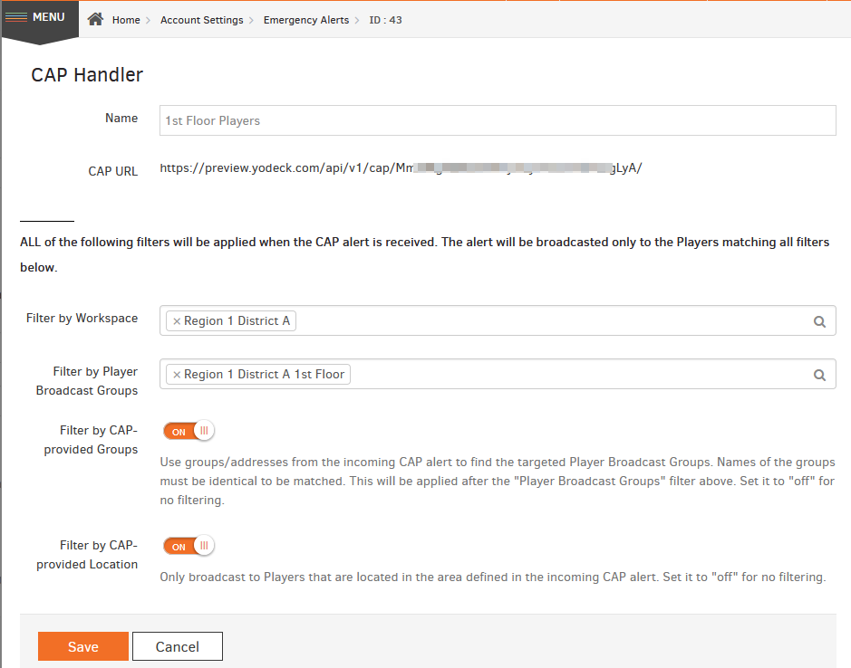 - Toggle to On if you like the incoming CAP alert from your system to broadcast on a specific location.