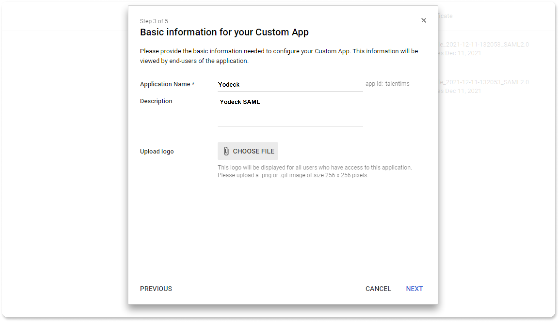 - On the next page give a name and a description for your SAML app and upload a logo image