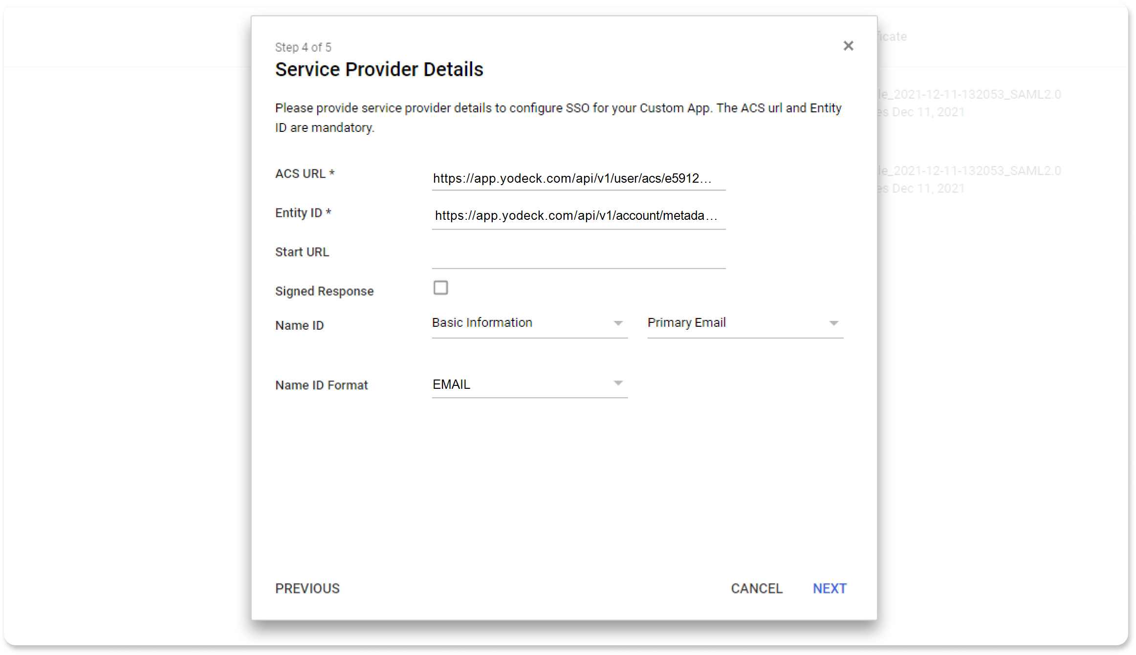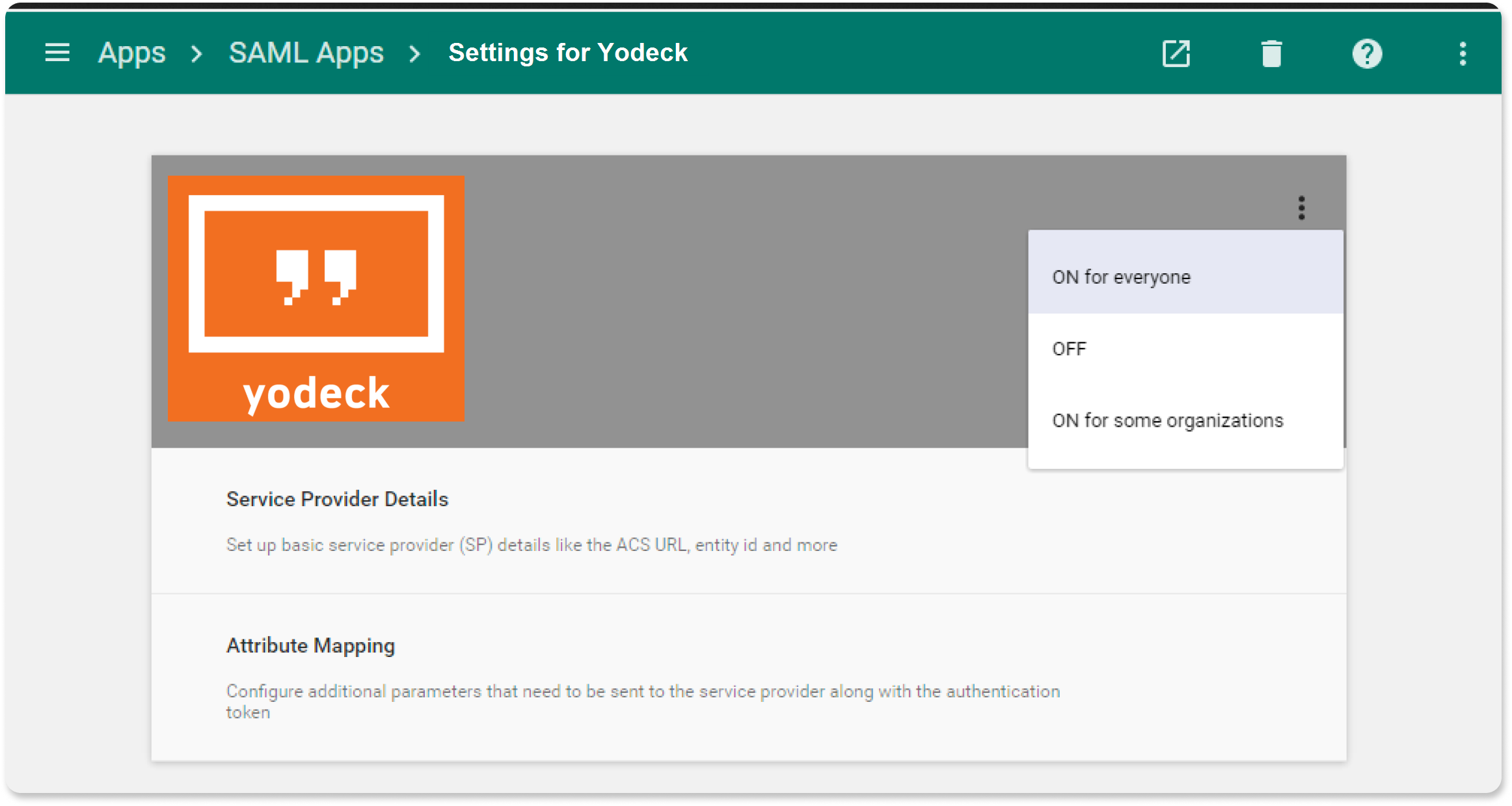 You will need to get from Yodeck the ACS URL, and Entity ID. Go to your Yodeck domain and navigate to Account Settings > SSO . - See Step 2 below for further information. Copy and paste them in this page.