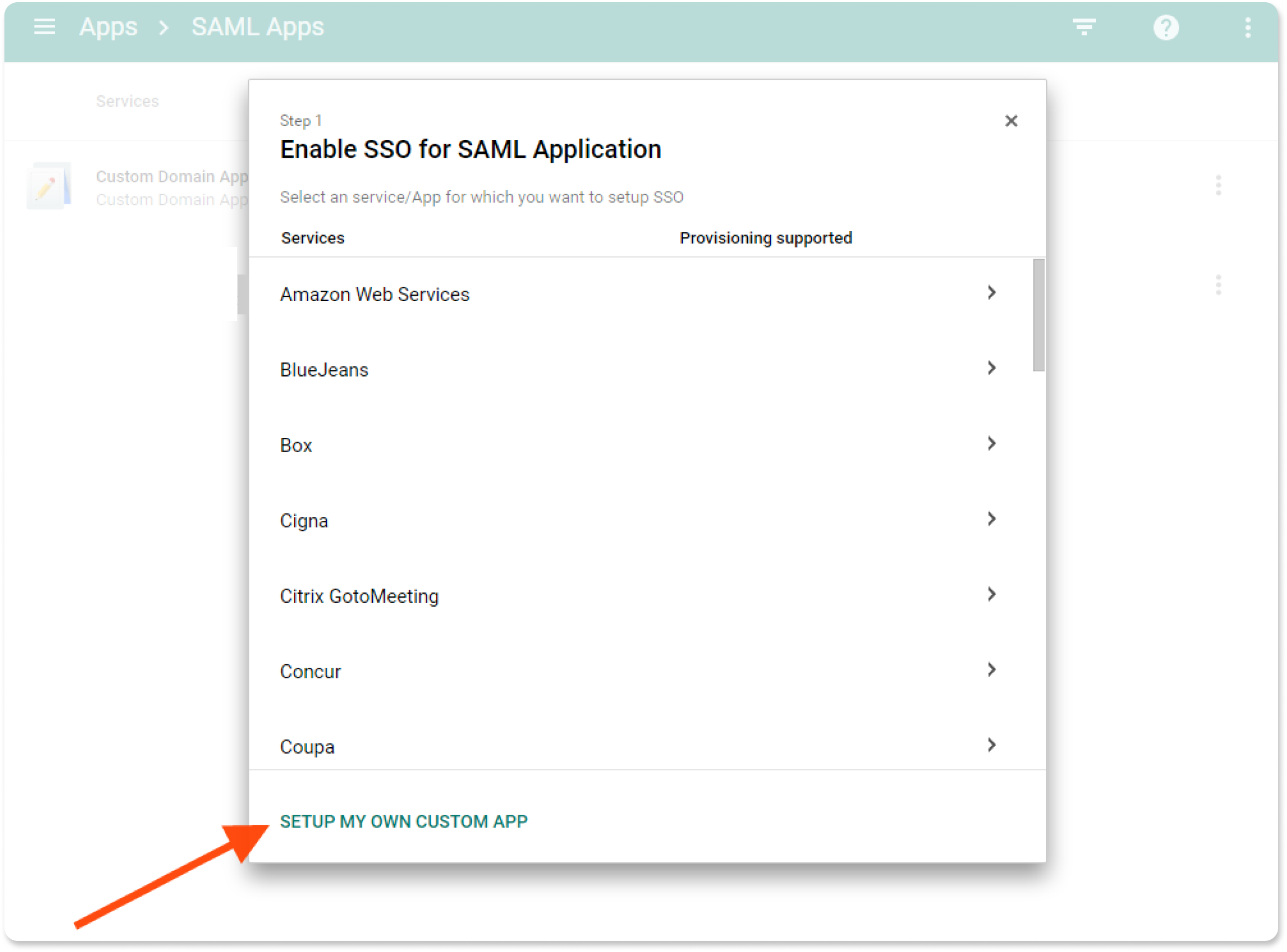 - As an administrator on your Google account, log in to Google Adminand click on Apps→SAML Apps . On the apps listing page click on the plus sign at the bottom right to create a new SAML App. On the pop-up modal, click on ” Setup my own custom app ” at the bottom