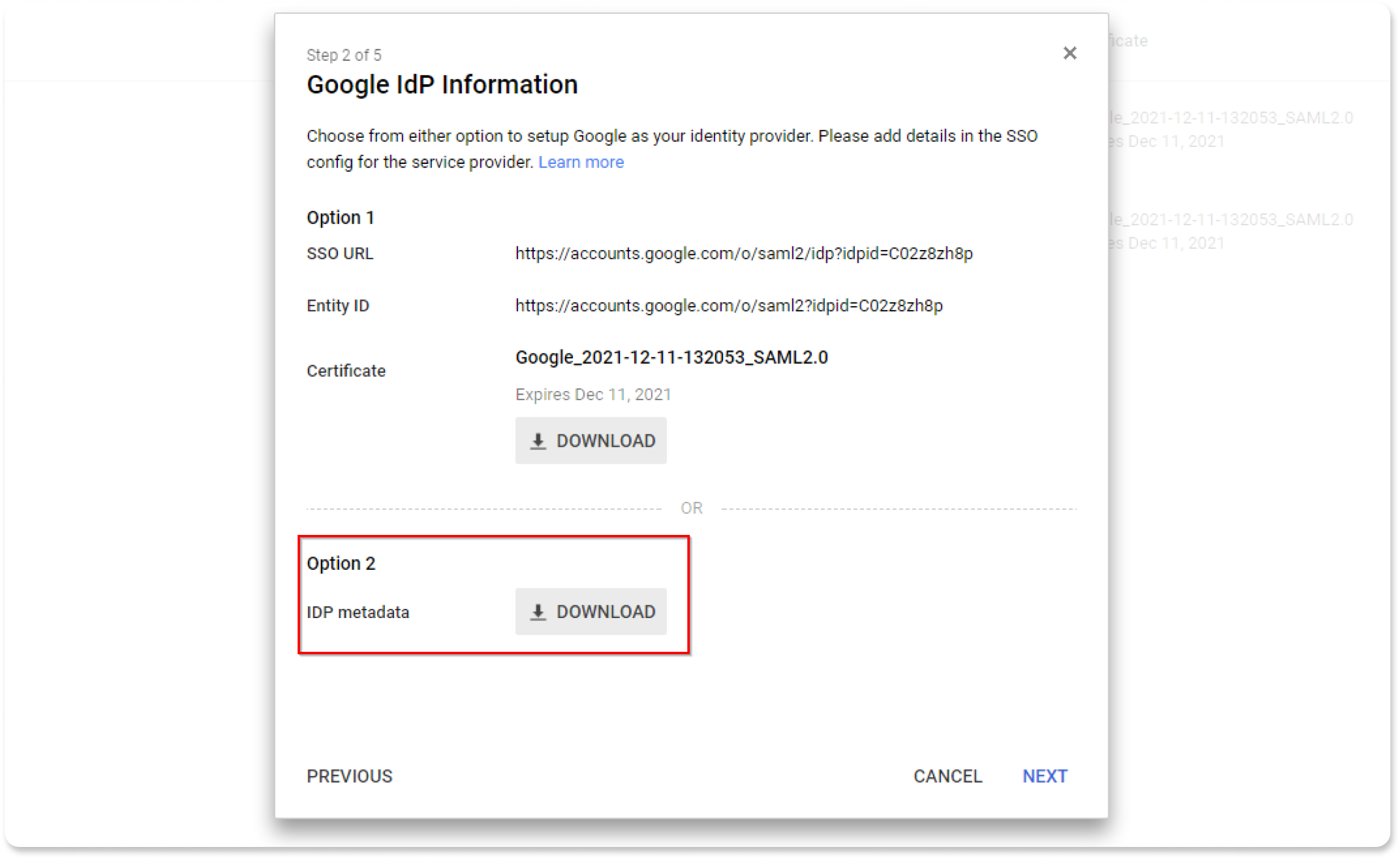 - On the next page, choose Option 2 and download the IDP metadata because you will need them to configure your Yodeck domain.