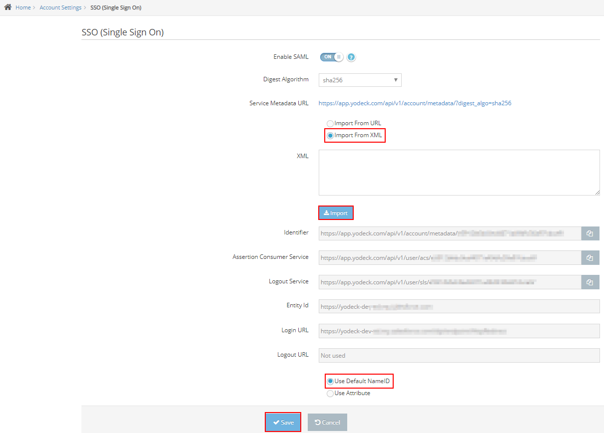 - Open the downloaded Metadata file with Notepad or any text editor and copy the whole text and paste the copied text in the XML field and click Import . Now you will see the URLs that have been pre-configured.