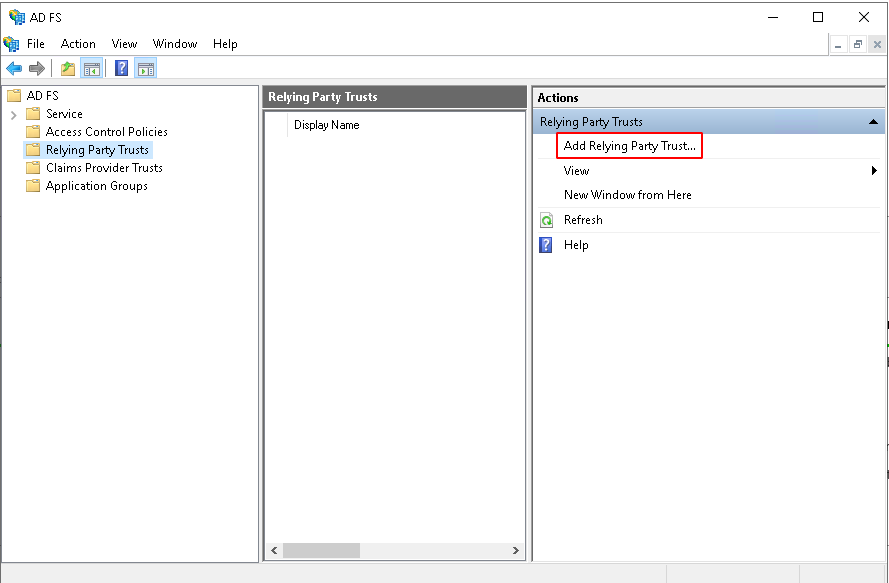 - Click Add Relying Party Trusts under the Actions bar on the right side of the screen. This will open the Add Relying Party Trust Wizard.