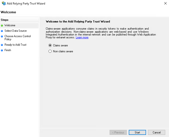 - On the Welcome page, leave the default Claims aware option selected and click Start.
