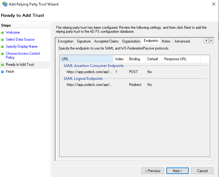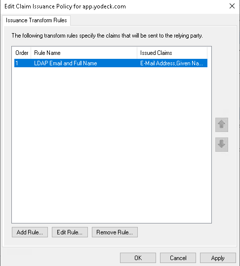 Select Pass through all claim values - You will now see both of your new rules in the list of claim rules for Yodeck. Click Apply and OK to close the Wizard.