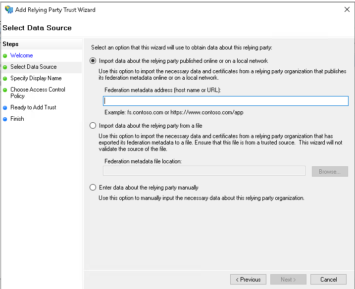 - On the Select Data Source page, select Import data about the relying party published online or on a local network. Use the Yodeck metadata URL and click Next .