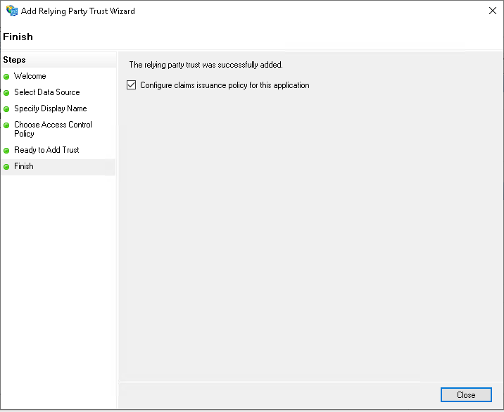 - On the next page, make sure the box is checked next to Open the Edit Claim Rules dialog for this relying party trust when the wizard closes. Click Close when finished.
