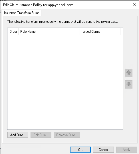 - Closing the Add Relying Party Trust Wizard will automatically open the Edit Claim Rules Wizard for Yodeck. Here, you will configure the attributes that AD FS will send to Yodeck. Click Add Rule .