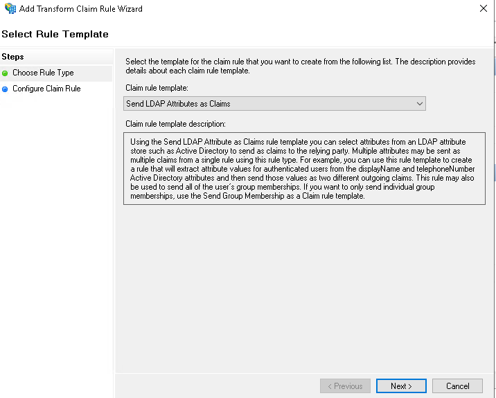 - Select Send LDAP Attributes as Claims from the dropdown menu.