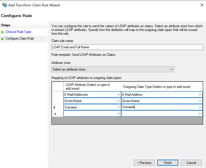 - Name the claim rule LDAP Email and Full Name and select the Active Directory attribute store. Then, add the following rules:Select E-Mail-Addresses in the LDAP Attribute column. Select E-Mail Address in the Outgoing Claim Type column.