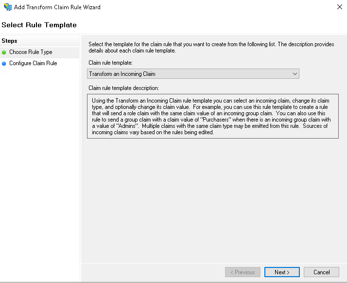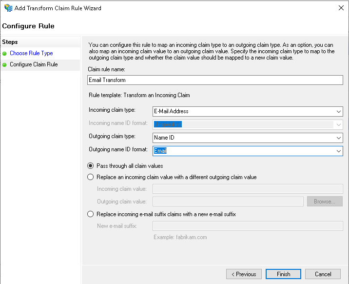 - Configure the following on the next page: Name the claim rule, Email Transform