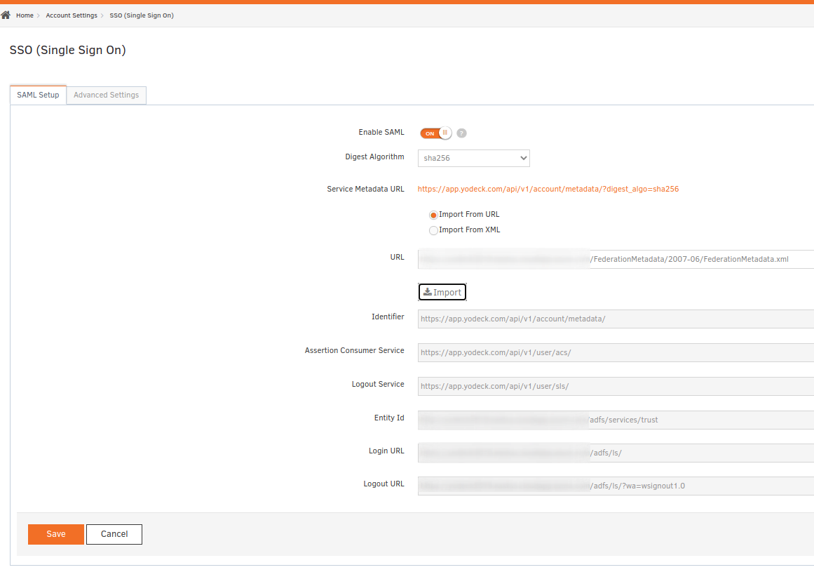 - Select Import from URL and use your ADFS metadata URL ( https://yourdomain/FederationMetadata/2007-06/FederationMetadata.xml ). There is a long dash in the federation metadata URL, be careful with that.