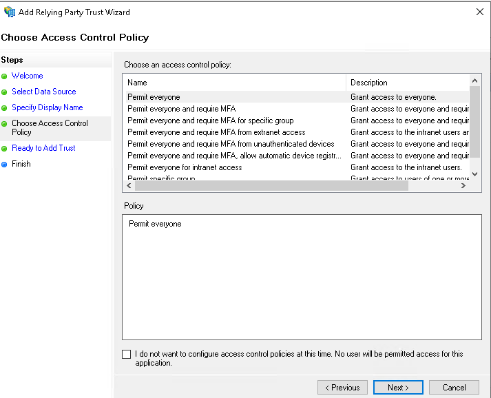 - On the Choose Access Control Policy, select your preferred policy (ex Permit everyone, Permit specific group) and click Next.